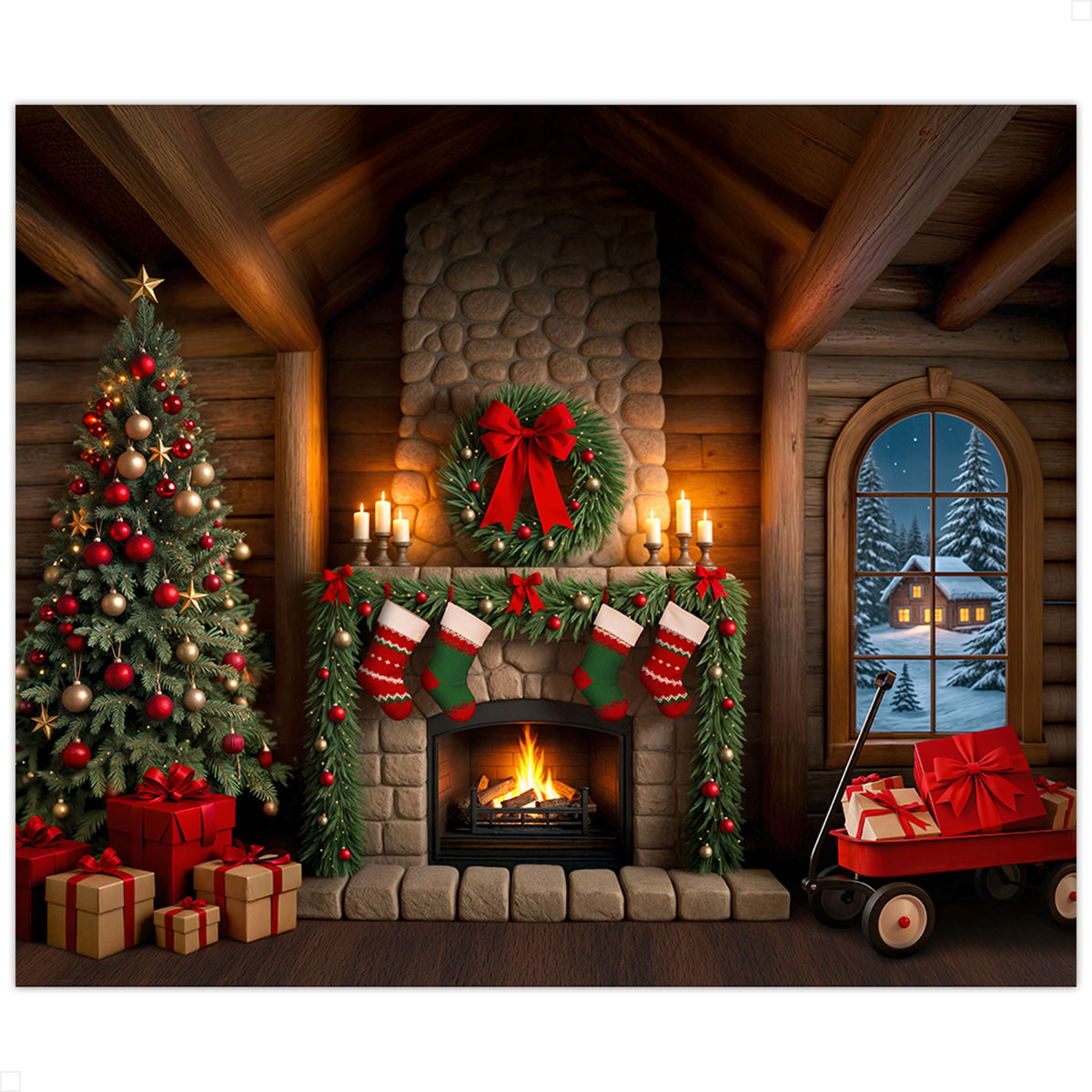 Fundo Fotográfico Natal Cabana de Madeira e Lareira de Pedra