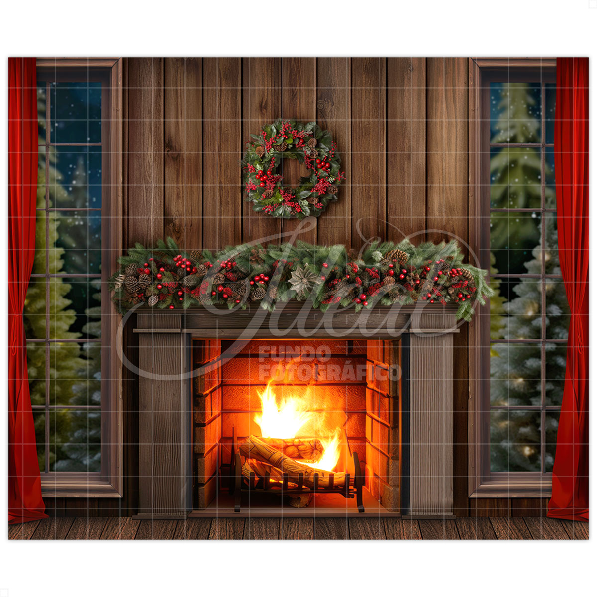 Fundo Fotográfico Natal Rústico com Lareira e Guirlanda