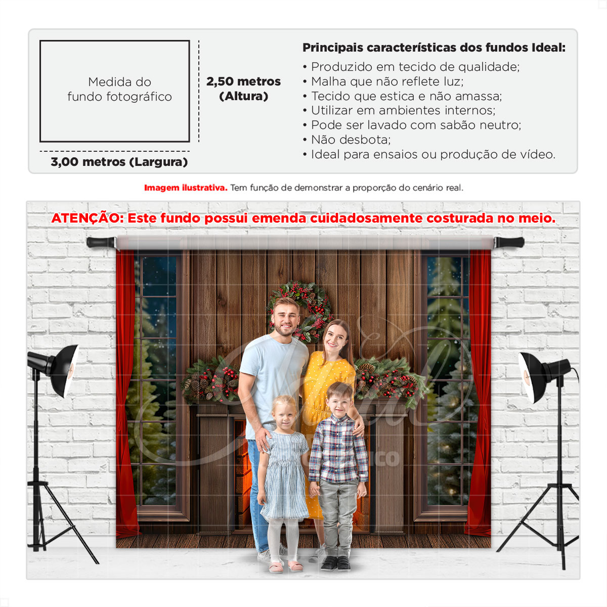 Um cenário natalino rústico e aconchegante, com lareira acesa, guirlanda clássica, madeira aparente e janelas com neve ao fundo. Ideal para mini sessões, família, infantil e pets, este fundo cria uma atmosfera calorosa de “cabana de inverno”, entregando profundidade e composição natural para retratos, cartões e campanhas sazonais. Ótimo para quem busca um backdrop natalino pronto para sessão rápida, storytelling e fotos com objetos de cena (presentes, mantas, meias e luzinhas). Se você procura um fundo que comunique Natal tradicional com elegância, este é o cenário certo.