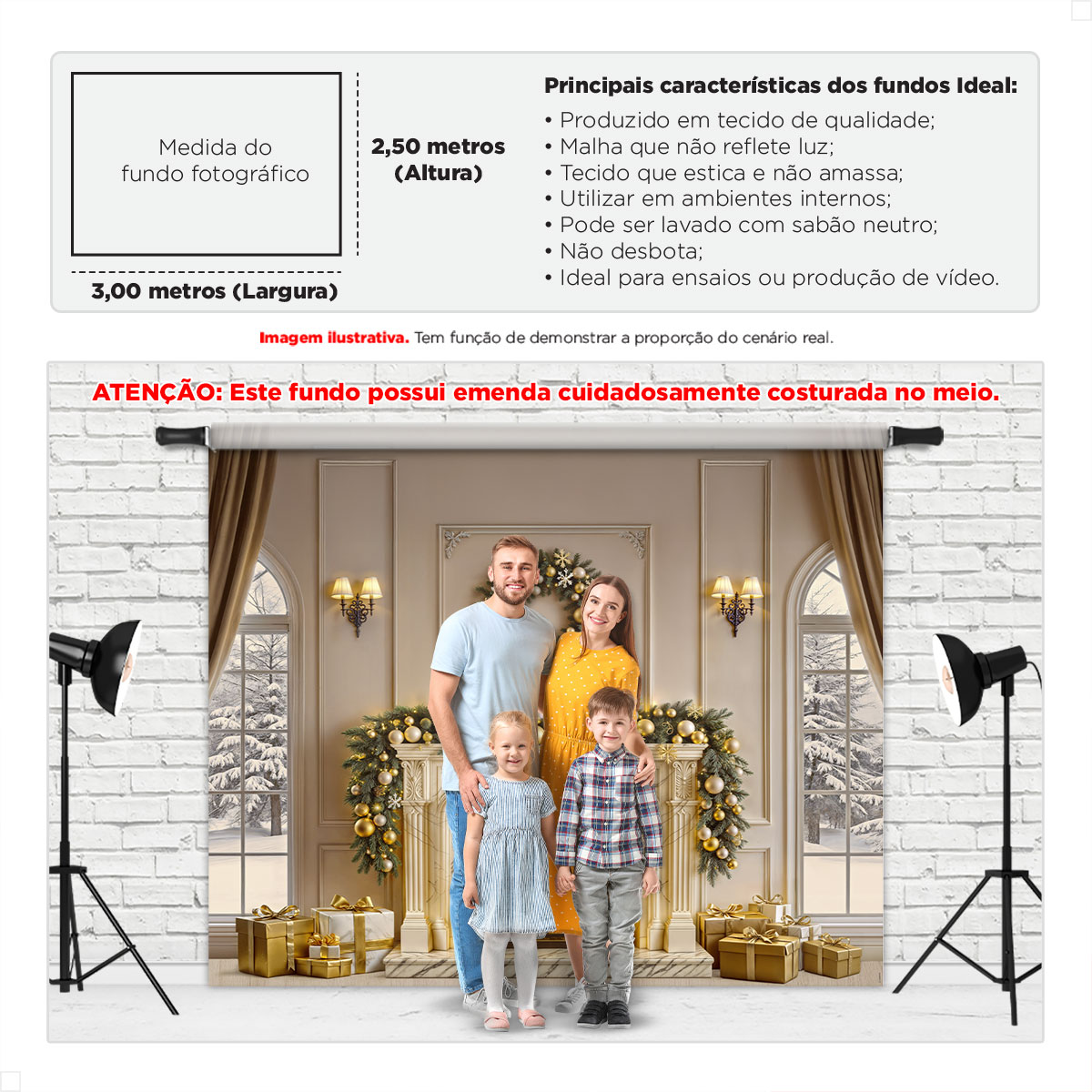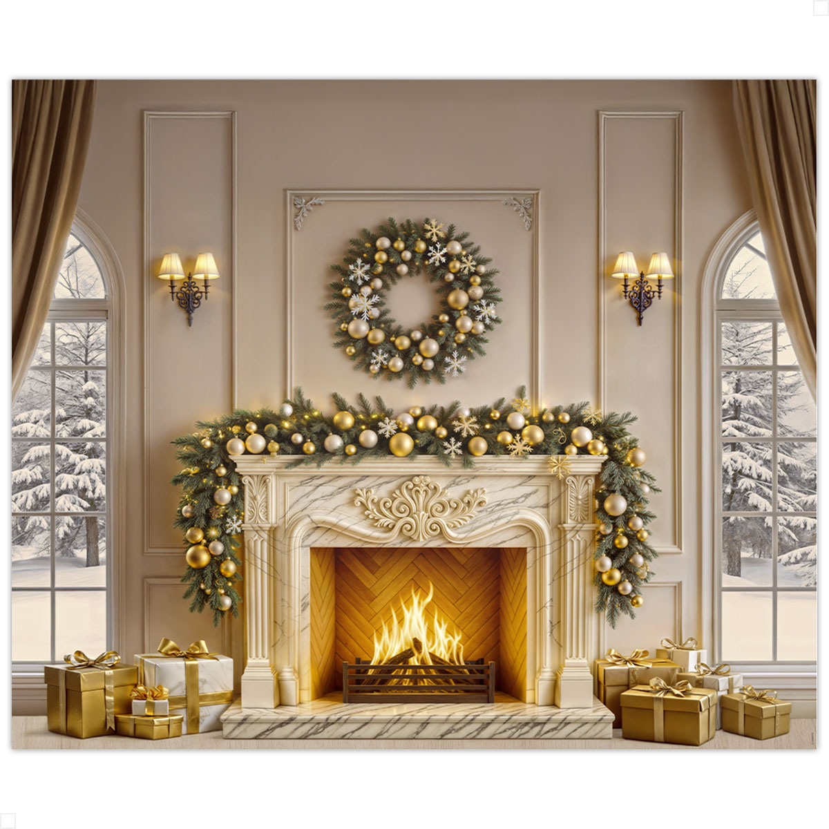 Fundo Fotográfico Natal Sala Luxuosa com Lareira de Mármore e Guirlanda Dourada