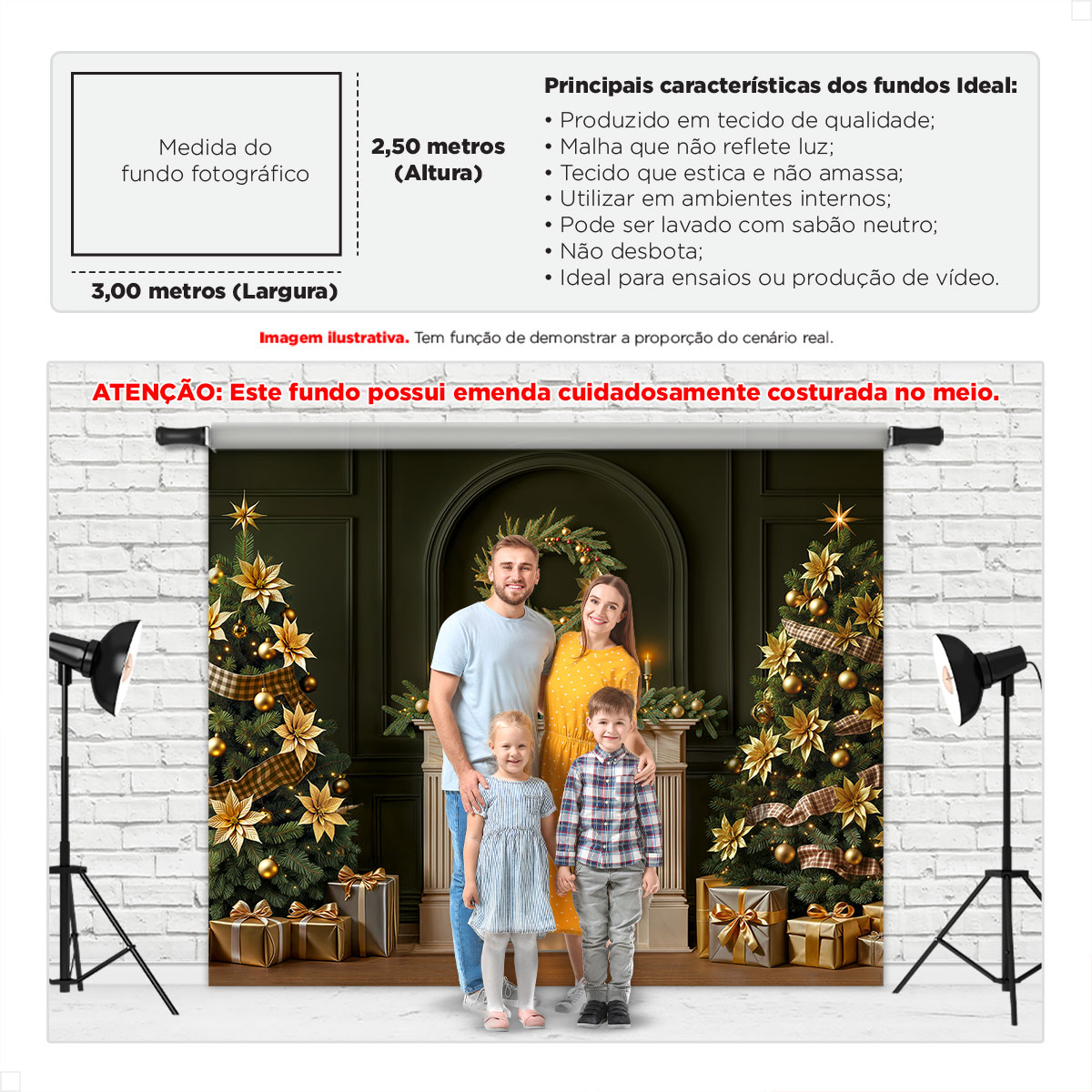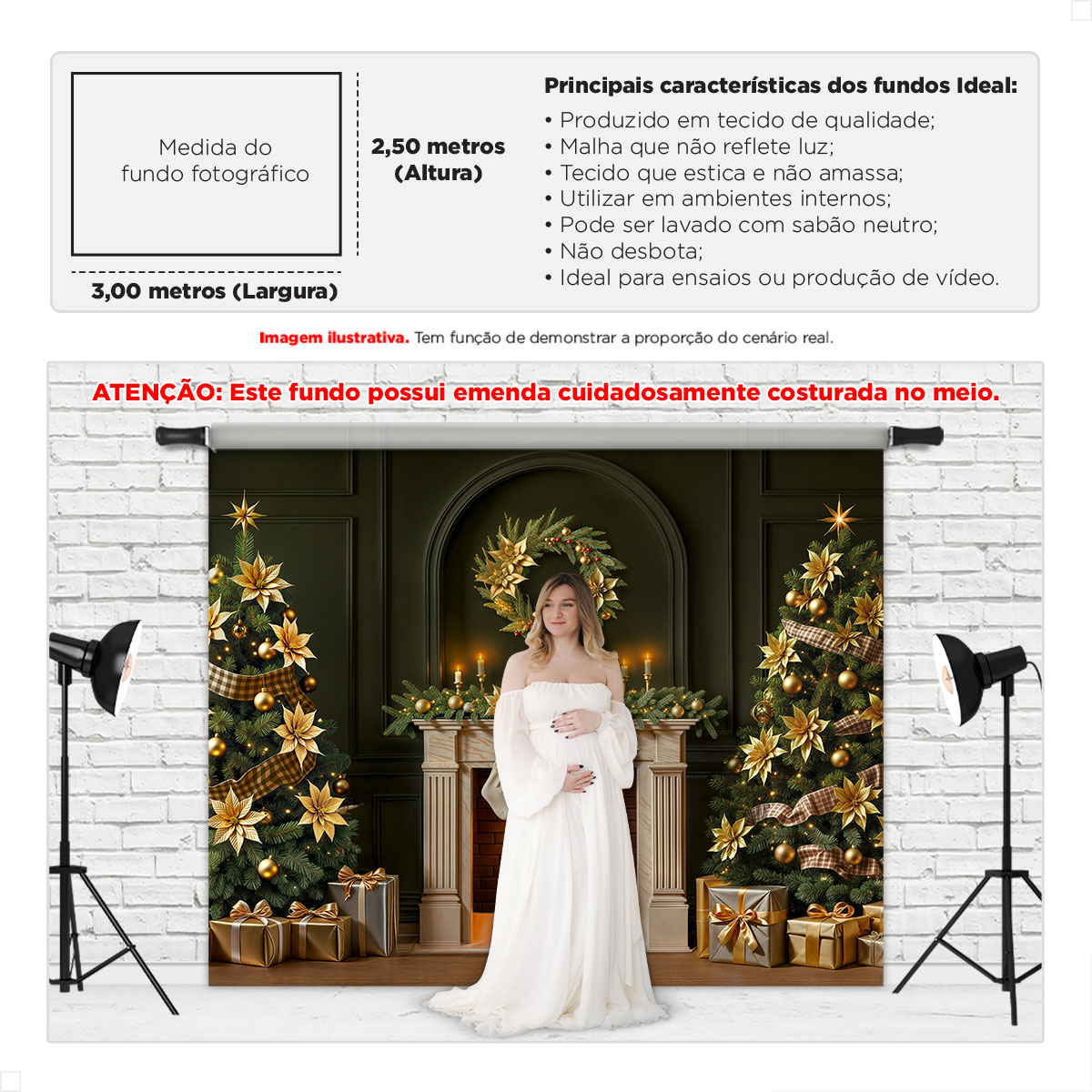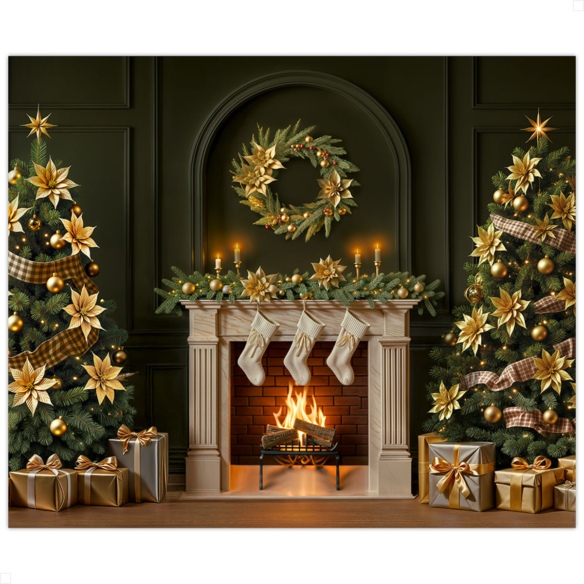 Sinta a magia do Natal ganhar vida no FNT-824. Duas árvores ricamente decoradas com poinséttias douradas e fitas xadrez vigiam os presentes reluzentes. Guirlandas iluminadas abraçam o ambiente, e o fundo verde-escuro com boiseries e arco adiciona elegância clássica. Um cenário acolhedor e luxuoso para criar memórias inesquecíveis em família, retratos infantis e campanhas sazonais.